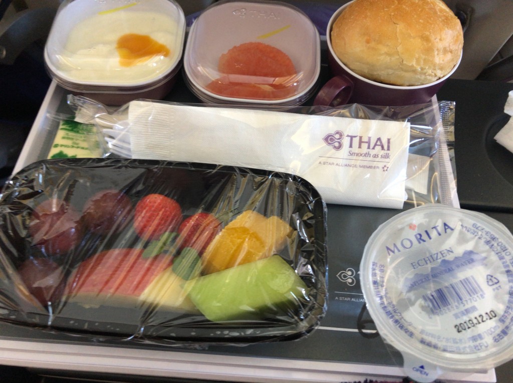飛行機については、今回はタイ国際航空を利用しました。タイへは6時間ほどで到着します。機内食も出ますが、母がよくわからないまま予約してしまったようで、ベジタリアン向けメニューになってしまっていました。パンとフルーツとヨーグルトだけでしたが、フルーツは6種も入っていて思っていたよりボリュームがあり、おいしかったです。
